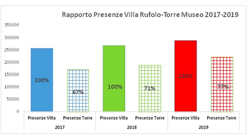 Come rilevabile dai grafici, dal 2017 ad oggi, le presenze assolute nella Villa sono aumentate costantemente nel tempo, e con esse sono aumentate pure le percentuali relative ai visitatori nella Torre, grazie all’attento piano di comunicazione e sensibilizzazione che la Direzione ha messo in campo. Oramai il delta è quasi tutto residuato ai visitatori meno abili per l’ascesa e a quanti interessati solo ad una foto panoramica, vittime di un mordi e fuggi purtroppo sempre più dilagante.